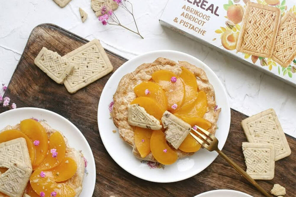 - Laat de taartbodems 10 minuten afkoelen en maak af met de perzikpartjes en verkruimelde Céréal koekjes.